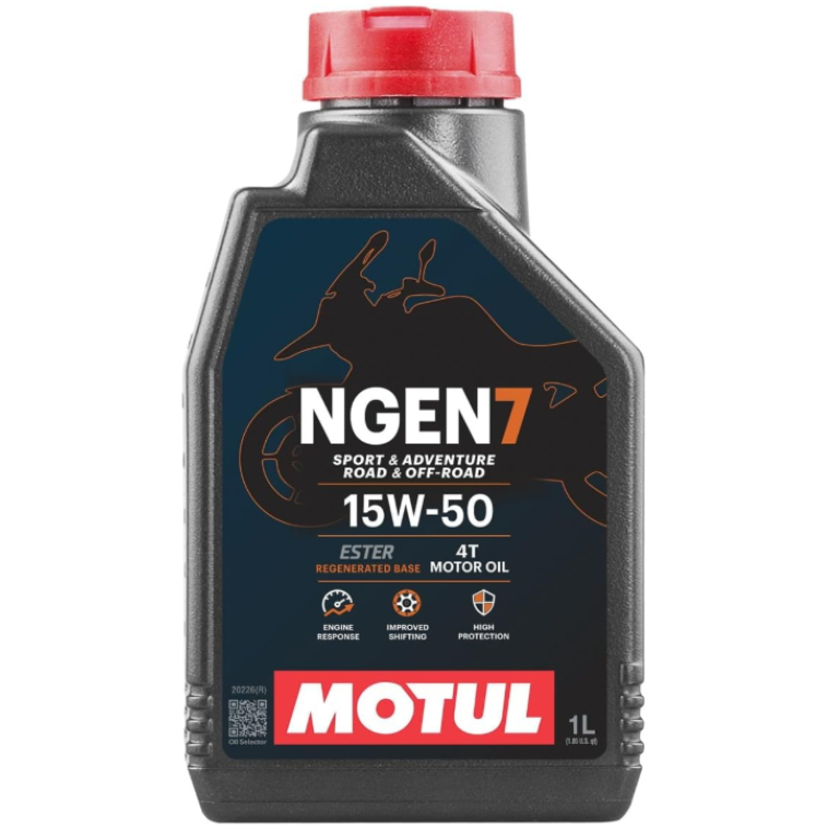 MOTUL NGEN 7 je najboljše v razredu motorno olje za 4-taktne motorje, ki temelji na kombinaciji najboljših baznih olj in dodatkov, pomešanih s sintetičnimi estri in visokokakovostnimi regeneriranimi baznimi olji. Primerno za vse vrste visokozmogljivih cestnih ali terenskih motociklov s 4-taktnim motorjem, z ali brez integriranega menjalnika, mokro ali suho sklopko. Popoln za motorna kolesa s sistemi za naknadno obdelavo izpušnih plinov, kot so katalizatorji ali sekundarni vbrizg zraka. Zasnovan za težke pogoje pri športni pustolovski vožnji. Druge uporabe: ATV, UTV, SxS, osebna vodna plovila (PWC) ali motorne sani, odvisno od priporočila proizvajalca o viskoznosti.